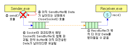 closesocket() 호출 시, 아직 send되지 않고 sendBuffer에 남이있는 Data를 어떻게 처리할 지 OS에게 선언하는 옵션이다. 이 옵션의 필요성을 설명하기 위해서 TCP의 send()와 recv()시의 버퍼상황과 전송과정을 설명할 필요가 있다. Sender.exe와 Receiver.exe 두 프로그램이 서로 연결된 상황을 생각해보자.